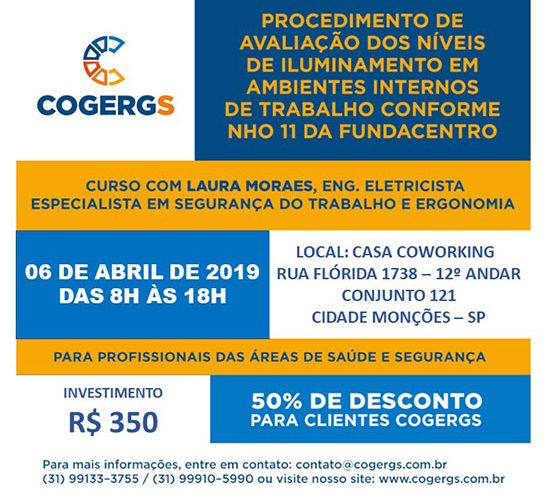 Curso Procedimento de Avaliação dos Níveis de Iluminamento em Ambientes Internos de Trabalho Conforme NHO 11 da Fundacentro Data: 06/04/2019 Horário: 8:00h ... Leia Mais